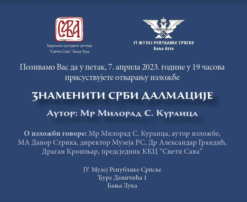 Обавјештавамо Вас, да ће се у Музеју Републике Српске, у петак, 07. априла 2023. године, одржати свечано отварање изложбе посвећене истакнутим појединцима који су оставили дубоки траг у српској култури, историји, науци и другим областима, а који су поријеклом с подручја Далмације и Крајине: „Знаменити Срби Далмације“ аутора Милорада Кураице. Организатори ове изложбе су Крајишки културни центар „Свети Сава“ из Бање Луке и Музеј Републике Српске.